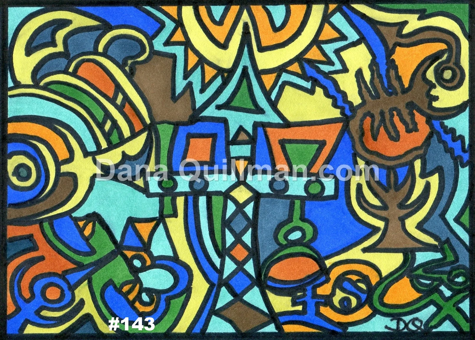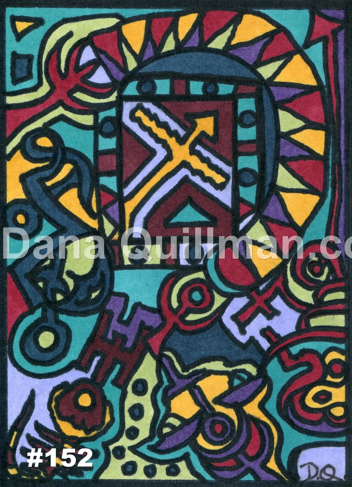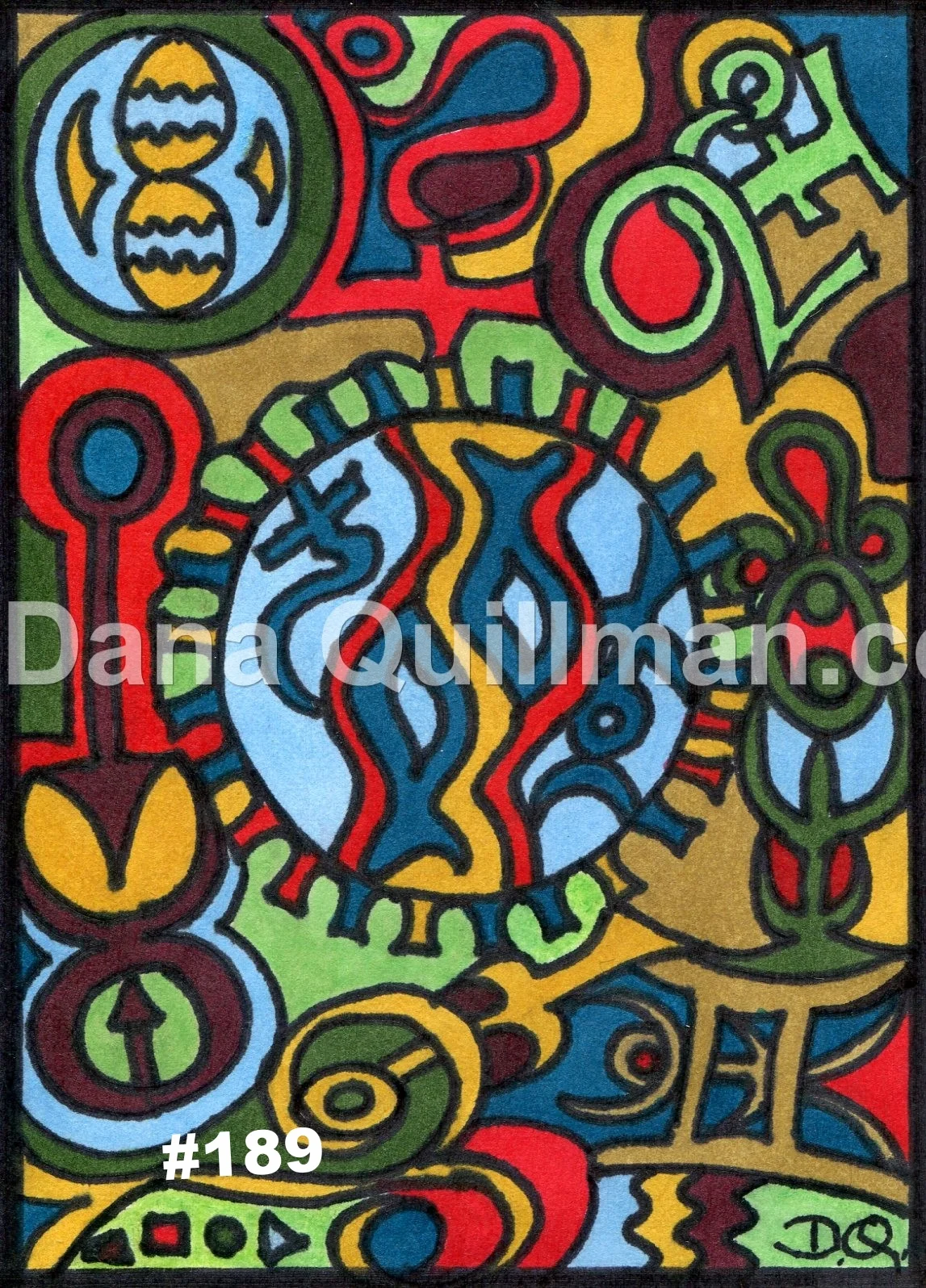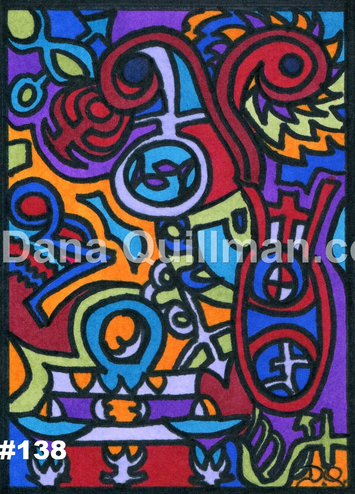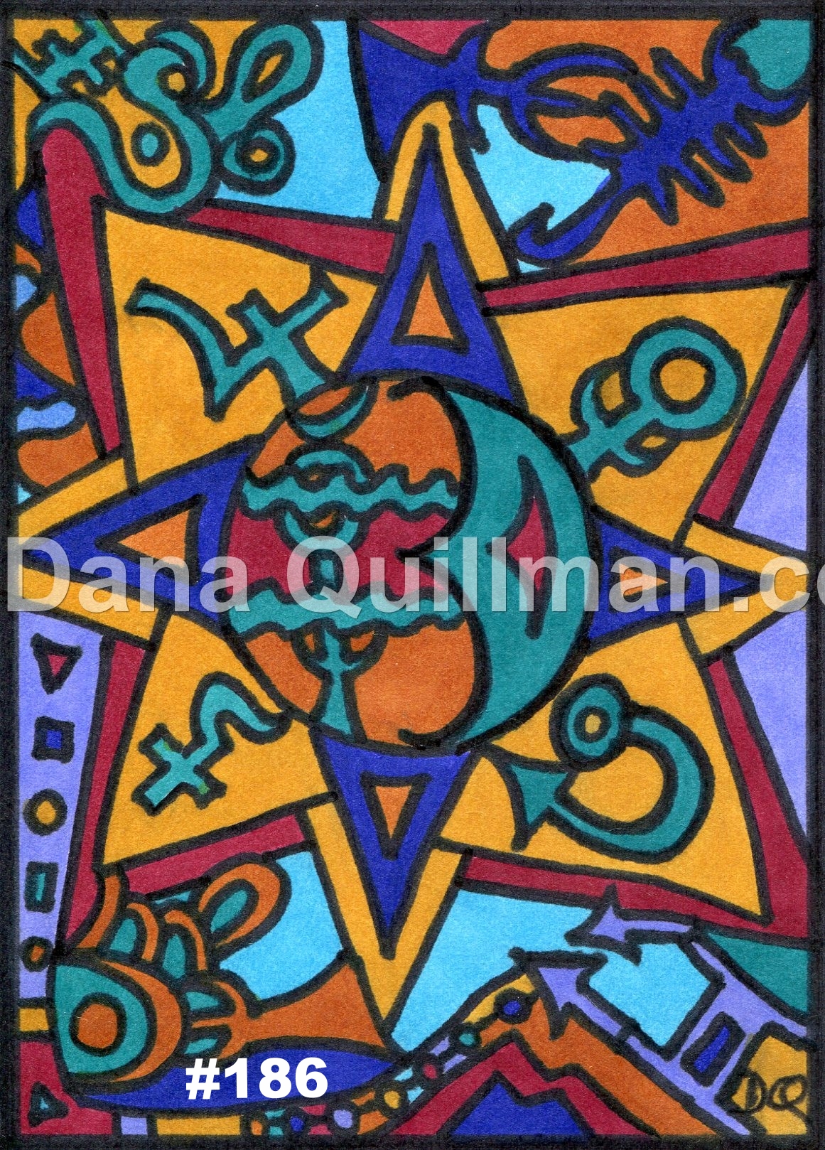 An Abstract Astrological Portrait (AAP) is an abstract design of a person's astrological natal chart using the symbols for the planets and the signs that they are in, the sign of the north node, and when an accurate time of birth is available, the rising sign, also known as the ascendant. The original is made using art markers on an approximately 4" x 6" piece of paper. Photo prints are then made of the design and then I make a set of greeting cards using the photo prints.